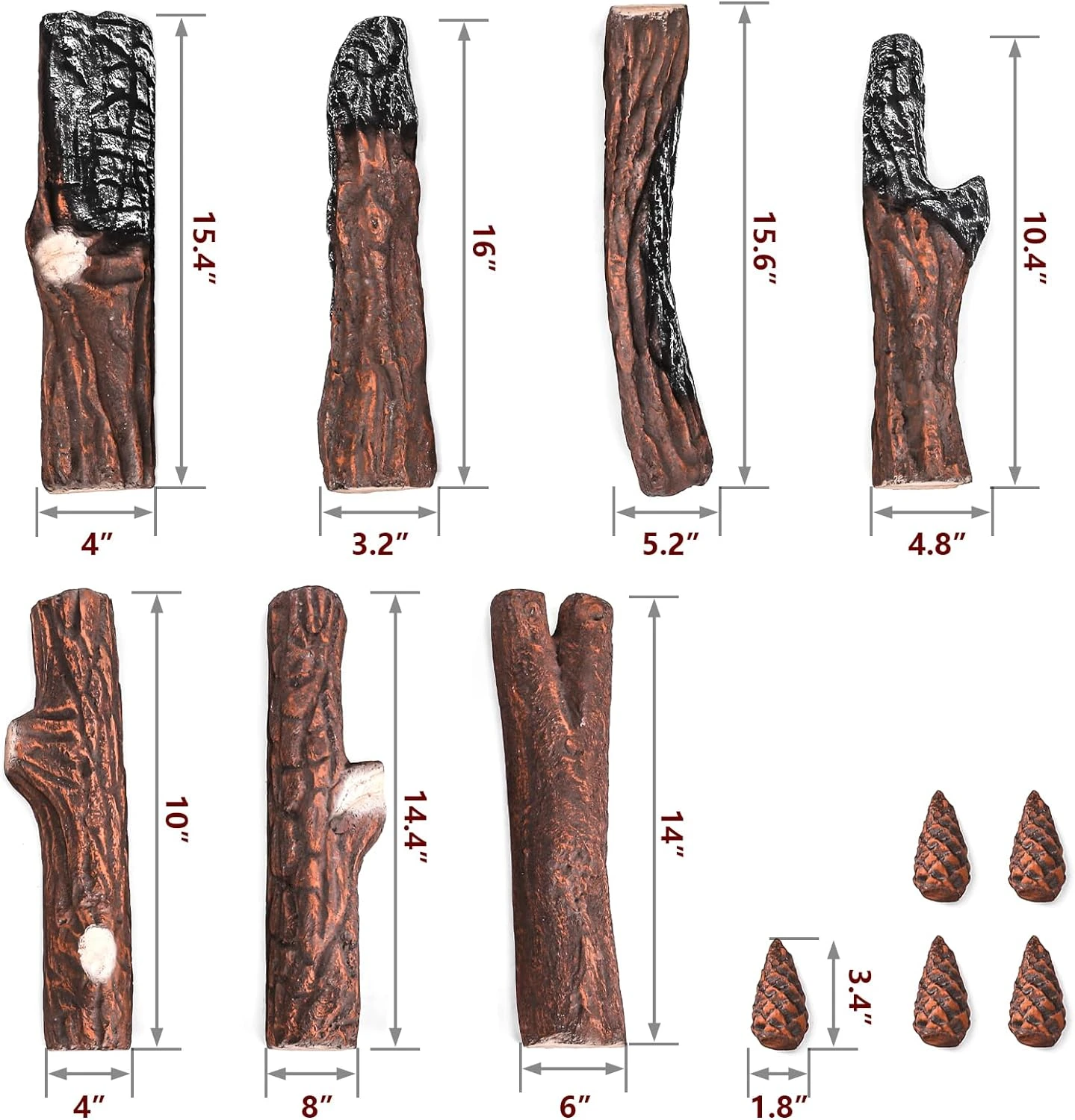 - 【Dimension】- Each log is approximately 14.8 – 16.1 inches long x 3.2 to 5.2 inches in diameter. Each pine corns is 3.4″x 1.8″. Large enough for your fireplace or fire pit. 【Package】- 7 different logs & 5 pine corns. 【Material】- Ceramic Fibers, which makes these wood logs look just like real wood logs when they are in the fire.