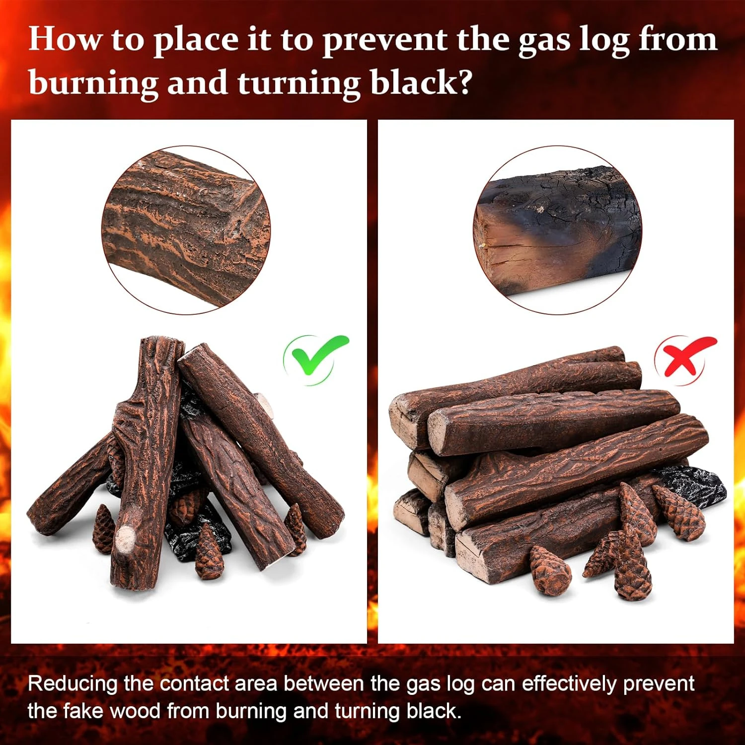 - 【Using Tips】- Incorrect placement of ceramic fireplace logs can lead to poor gas combustion and cause birch gas fireplace logs to turn black. To prevent birch logs from turning black in the fireplace, you must adjust the placement of the birch fireplace logs so that each ceramic fireplace log has a minimum contact area and even internal air circulation