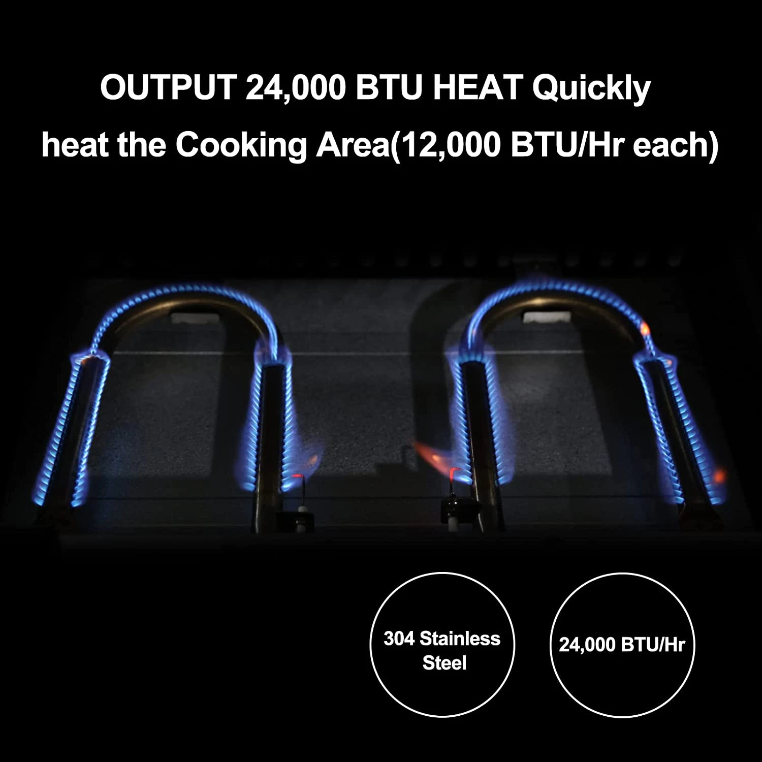 - 【304 STAINLESS STEEL BURNERS】- 2 * 304 stainless steel burners emit up to 24,000 BTU of heat in total (12,000 BTU each), provide rapid and even heat to 2 independent temperature zones. Temperature can be adjusted as you wish from low to high. 【COOKING EASLY】- It features a twist start ignition for easy lighting which can be started quickly and easily