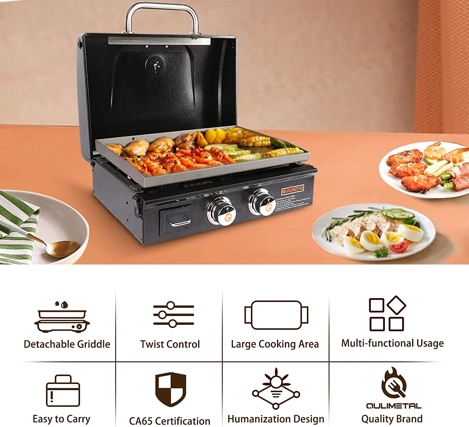- 【LARGE COOKING AREA】- This tabletop griddle comes 348 square inches griddle surface, which offers plenty of cooking space. 【MATERIAL OF GRIDDLE TOP】- The thick, cold-rolled steel surface of the Our Two-Burner Gas Griddle. 【DETACHABLE GRIDDLE FOR MULTI FUNCTION】- The grill can be detach in parts for easy clean up. Moreover, you could heat and boil soup, water, other liquid and pizza. 【SAFETY USE】- Our portable gas grill owns good quality certificated by CSA