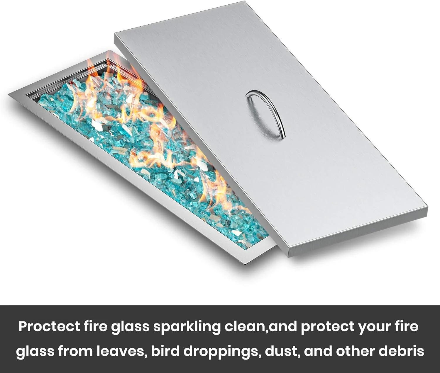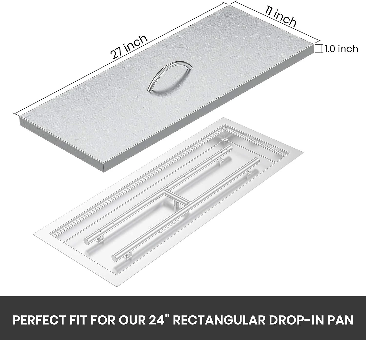 - Dimensions: Measures 27″ L x 11″ W x1″ H, designed to cover designed to cover 24″ x 8″ Rect fire pit drop in pan.