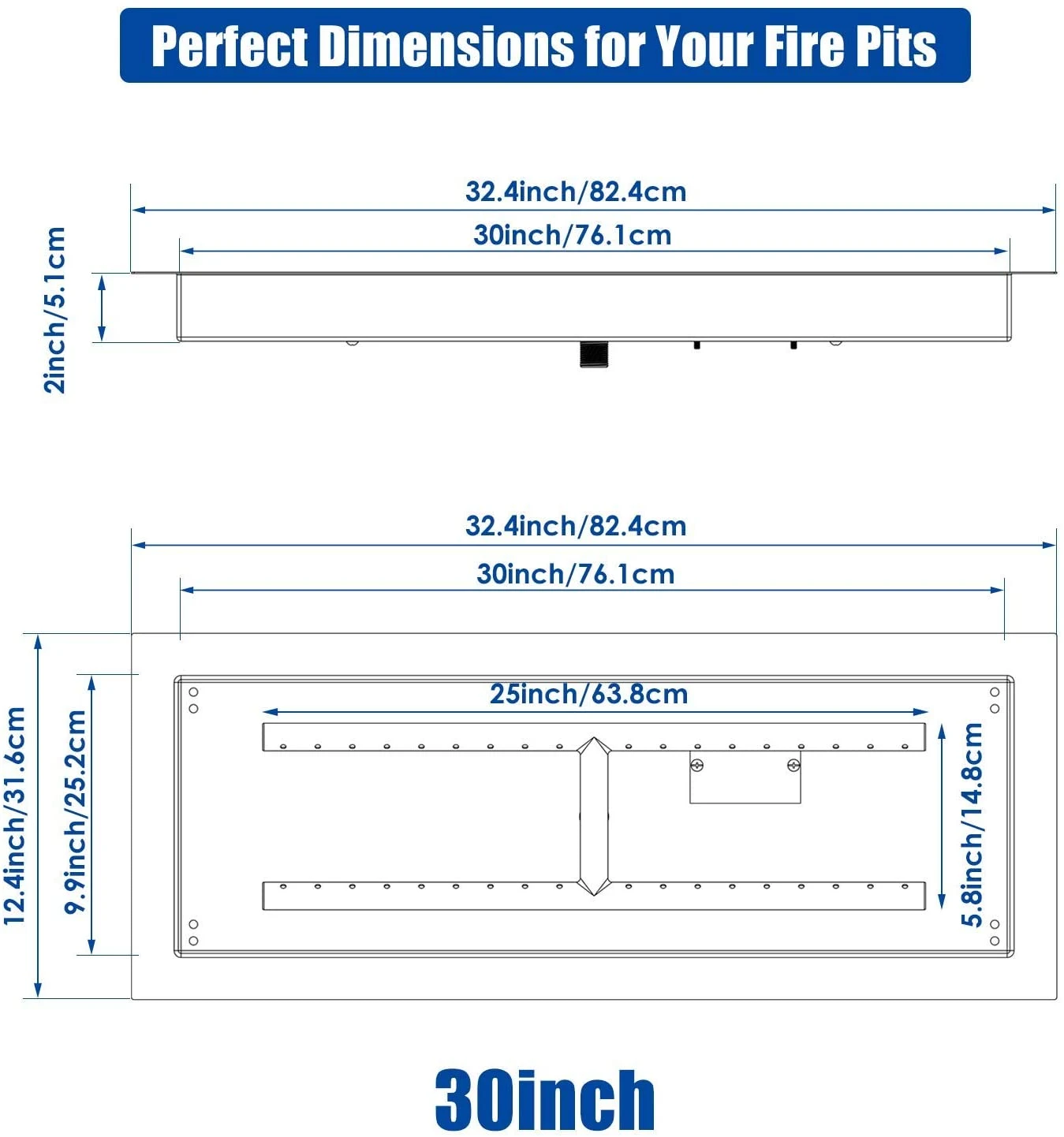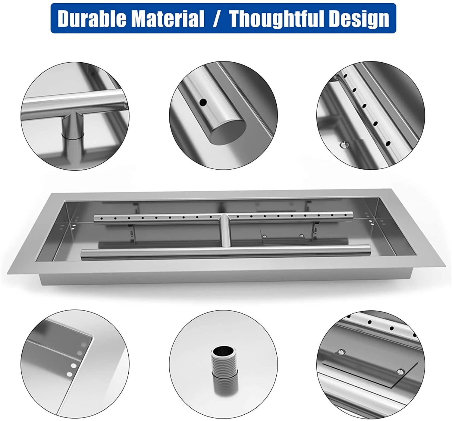 - Dimensions: 30″ x 10″ (76.2cm x 25.4cm) Rectangular Drop-in Fire Pit Burner Pan, H-shaped fire pit burner, we include two 3/8″ (0.95cm) male flared x 1/2″ (1.27cm) NPT fittings for your convenience.