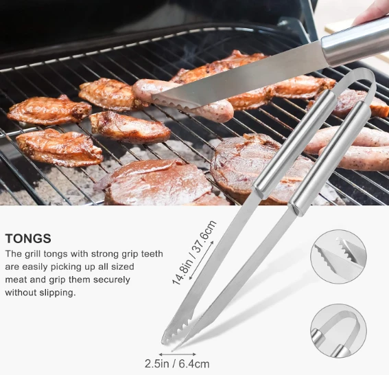 - Complete Grilling Set – The BBQ tools set includes 4 in 1 spatula, meat fork, power tongs, 2 meat claws, cleaning brush, 8 corn holders, salt&pepper shakers, knife, basting brush, 4 BBQ skewers, silicone glove and stainless steel straws set in a storage carrying bag.