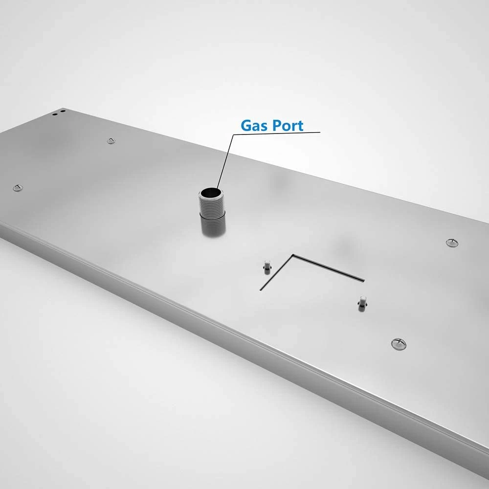 - Dimensions: fire pit burner pan 36″ x 12″ (91.44cm x 30.48cm); face plate 7” L*3 13/16” H (17.78cm x 9.68cm); Base Plate: 3 13/16” H*3 13/16” W (9.68cm x 9.68cm). 1/2″ (1.27cm) female NPT*1/2″ (1.27cm) female NPT, we include two 3/8″ (0.95cm) male flared x 1/2″ (1.27cm) NPT fittings for your convenience.