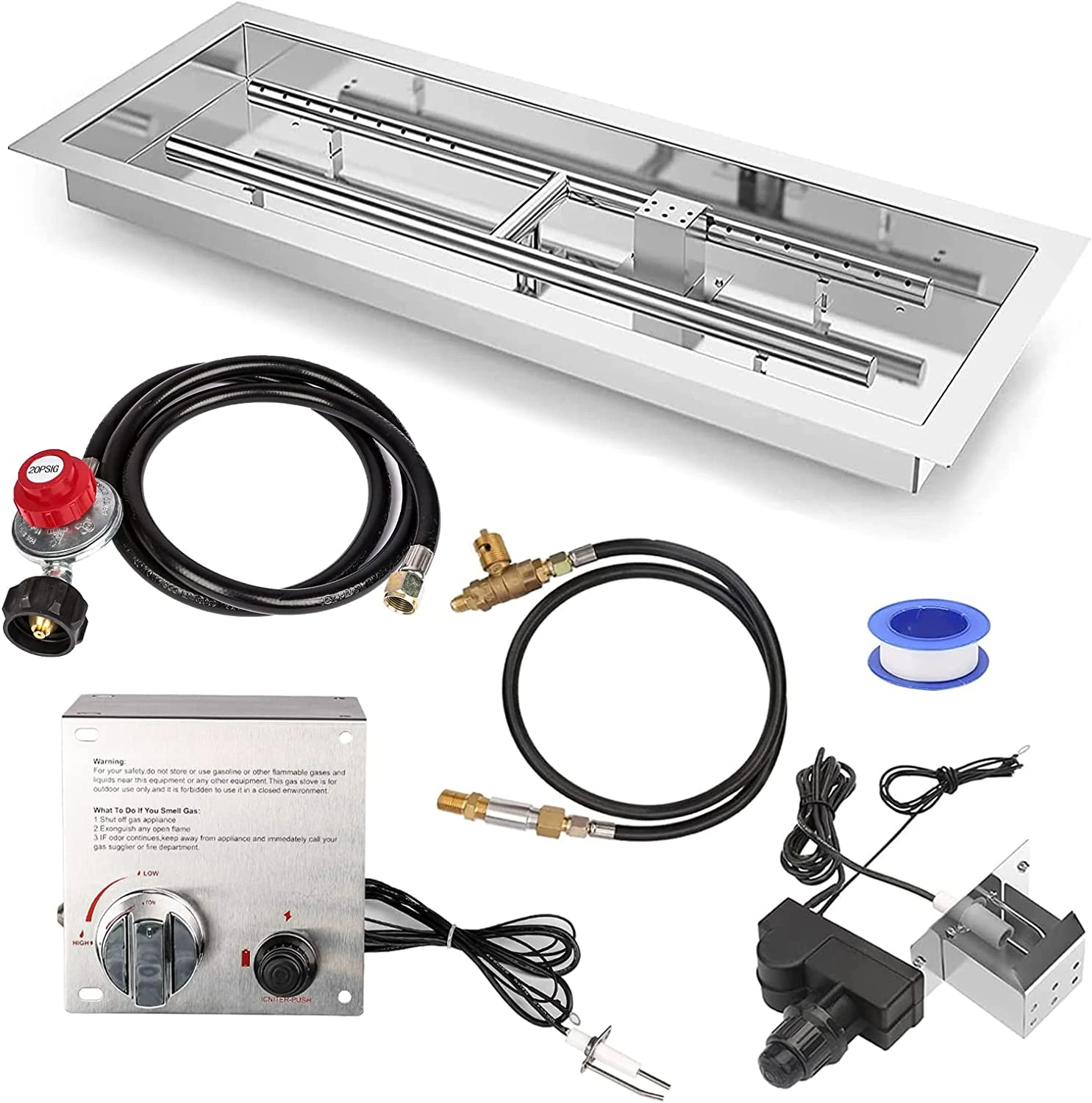 - Package: Including a burner pan, Ignition kit with shut-off valve, 24” non-whistle stainless steel gas line, 5 ft gas hose and fittings, requires a AAA battery (not included).