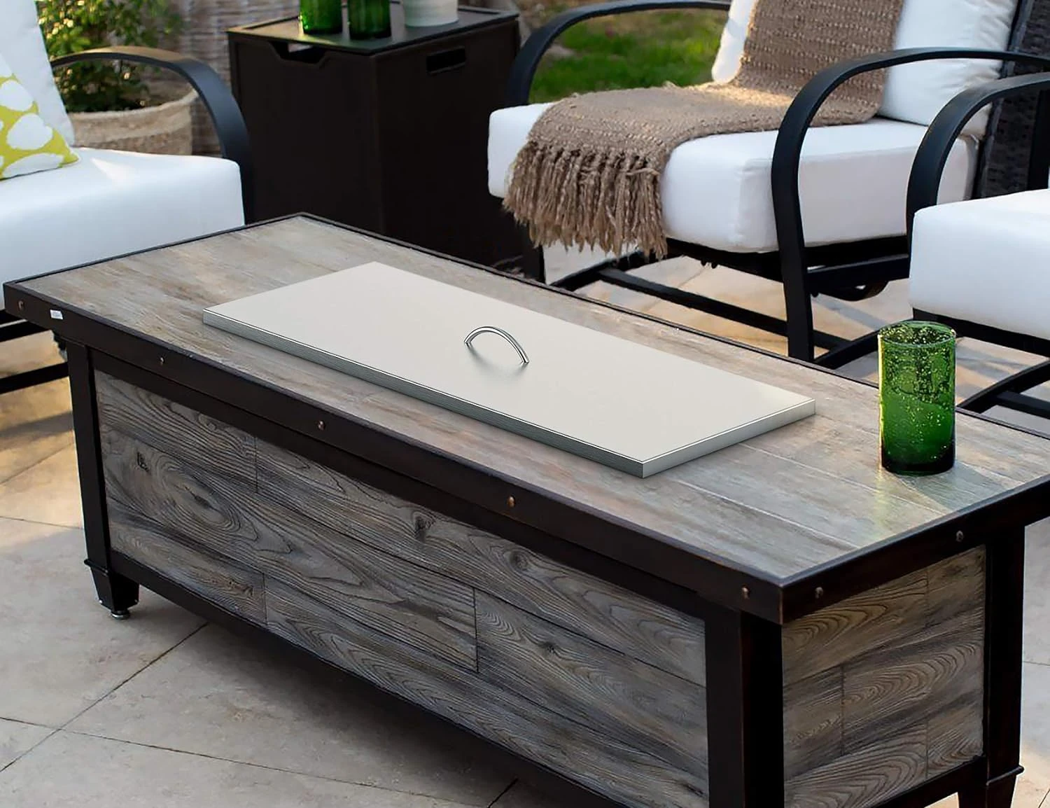 - Dimensions: Measures 51″L x 17″W x 1″H , designed to cover 48″ x14″ Rect fire pit drop in pan.