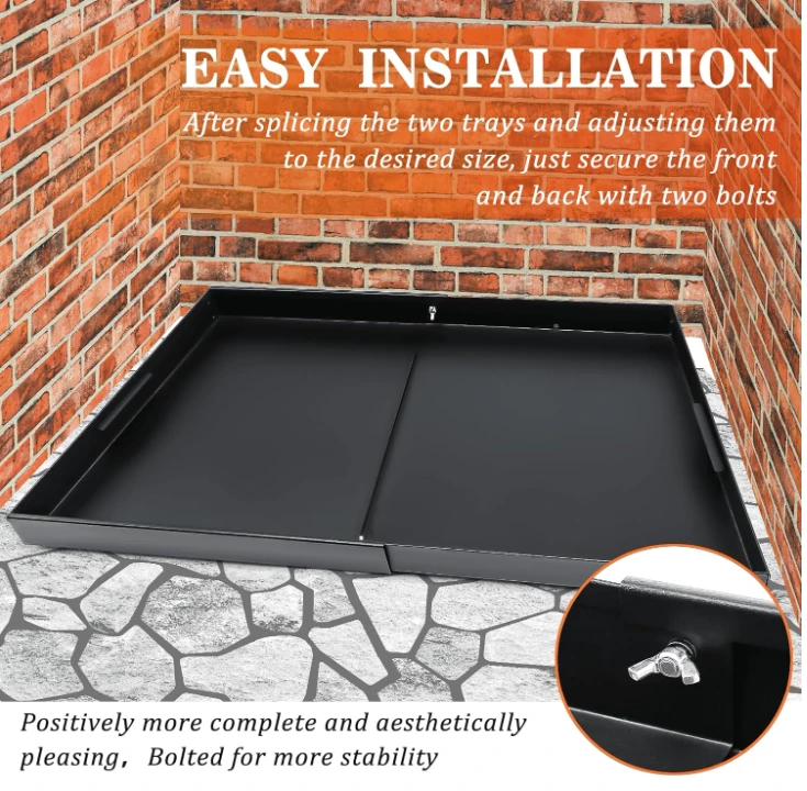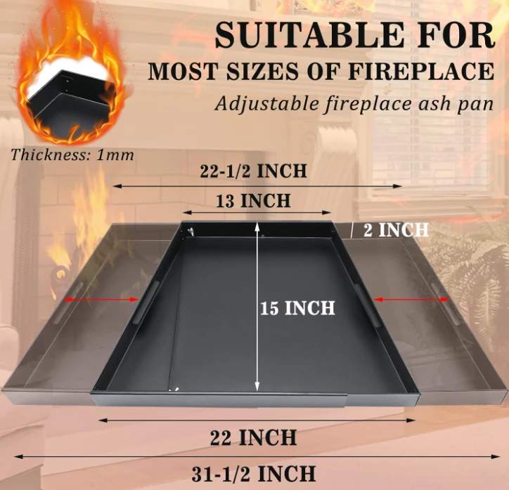 - [Adjustable Design] – Our fireplace ash pan is designed to fit most sizes of fireplaces. Expandable size from 22 inches up to 31-1/2 inches. Easily adjust the two trays to the desired size and secure them with two bolts for a perfect fit.