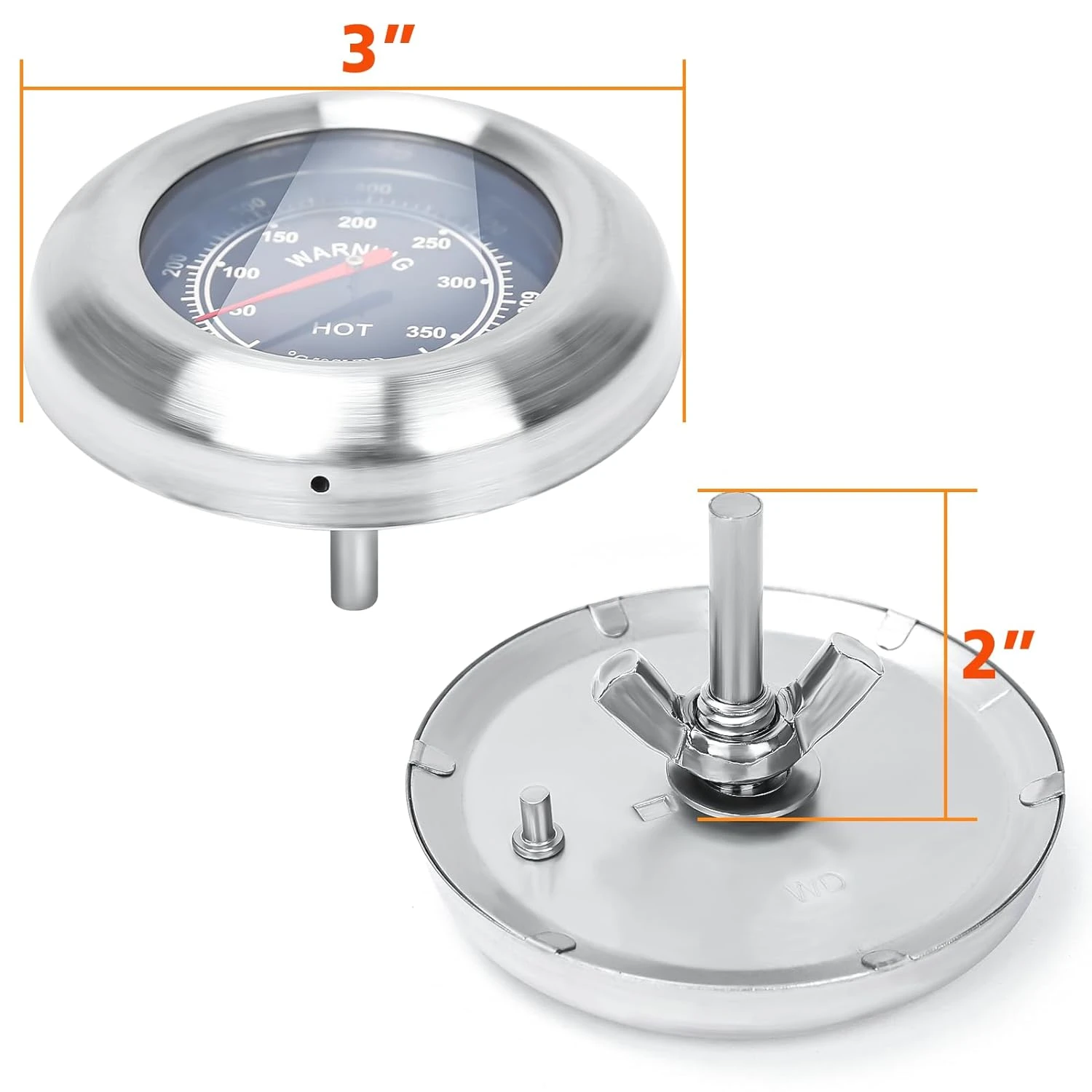 - Dimensions: face-3” dia x 2” H. Made of high-quality stainless steel. Accurately Measures Temperature from 100 ° F up to 700° F. Accuracy in ±0.5%. Universal thermometer.