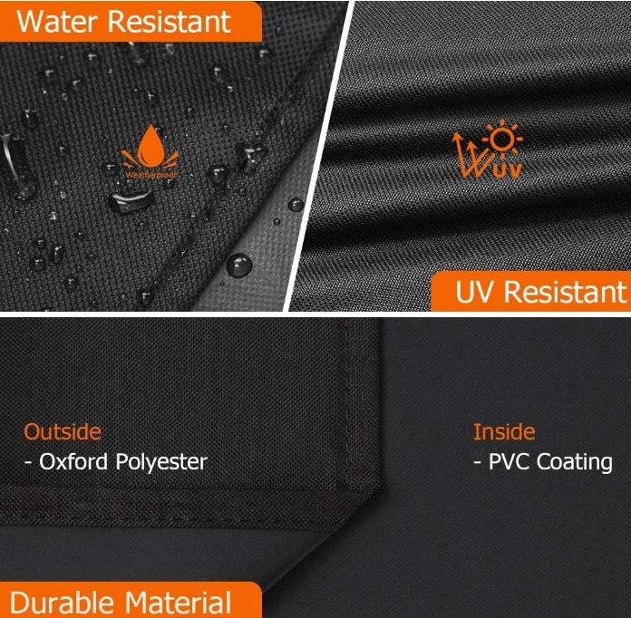 - 【600D Heavy Duty Oxford Fabric】Made of 600D Heavy duty oxford polyester with water resistant PVC coating, water repellent and anti-UV finish, high heat resistant, easy to withstand tearing, fading, wetting and cold cracking, keeping your grill protected from harsh weather year-round.