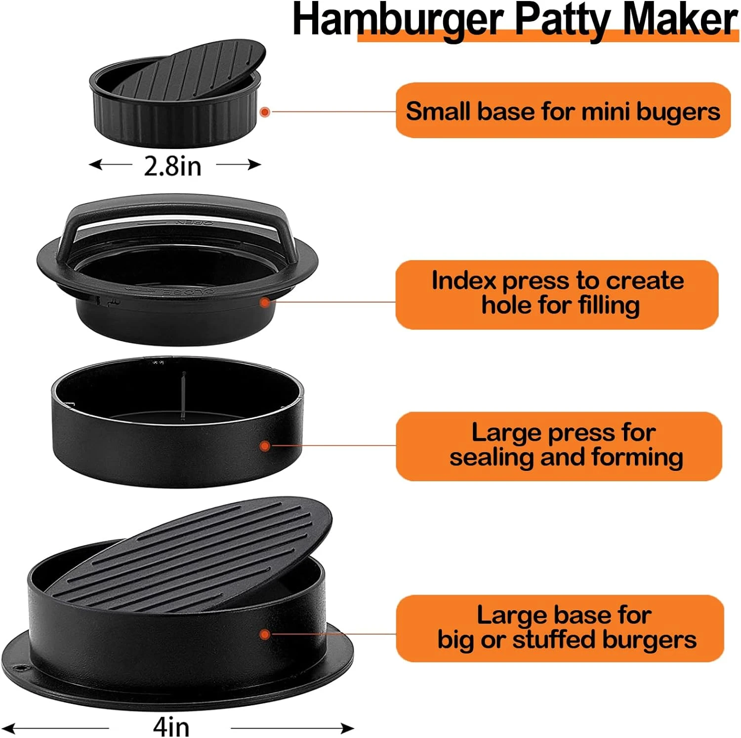 - A must-have tool for burger lovers, the griddle accessories set also comes with burger patty maker press, the patty maker has 2 different size of base, 2.8 inch one for sliders and mini burgers, 4 inch one for big and stuffed burgers, with this tool it would be easy to make neat burger patties at any time