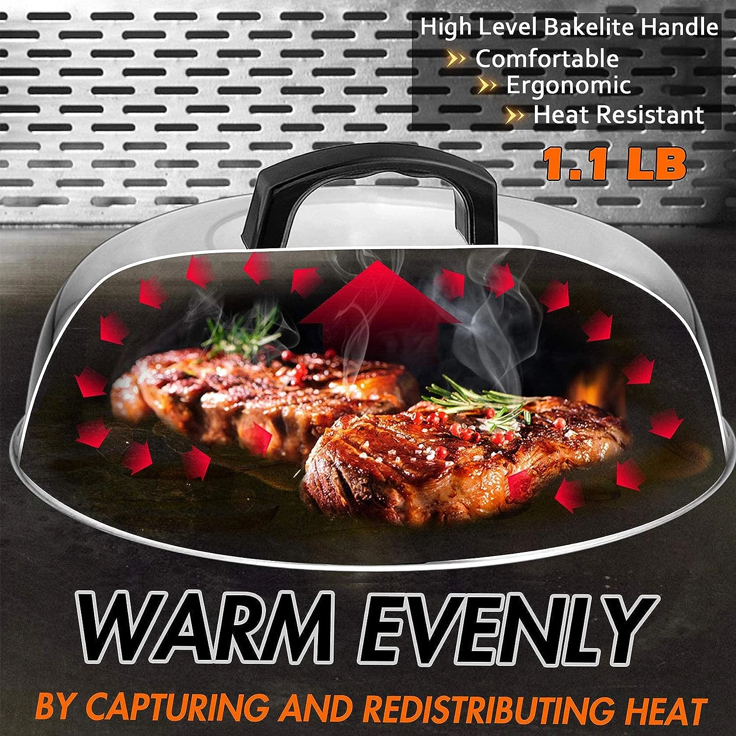 - 12 inch basting dome, made of premium stainless steel, sturdy structure and high-quality components, 12 inch basting dome would not bent or crack, it could cover a large amount of food at a time but weighs only 0.8 lb, very easy to carry and use, keep oil splattering down to a minimum, covering foods with dome could form a closed environment to concentrate heat and cook more evenly, keep food juicy, make cooking effortless and faster, it is easy to clean and dishwasher safe for time saving