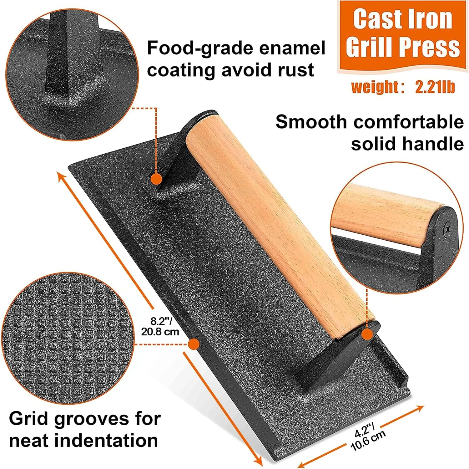 - Cast iron grill press, heavy duty flat iron helps to press out the unwanted grease and the meat would be more fluffy, makes griddle or grill cooking much healthier and faster; the neat grids at the non-stick bottom can form beautiful indentations on the meat, long smooth comfortable wooden handle prevents your hand from scalds, without any harmful coating released in your foods, rust-proof and corrosion resistant, heat resistant handle is solidly installed, enjoy cooking with this durable kit