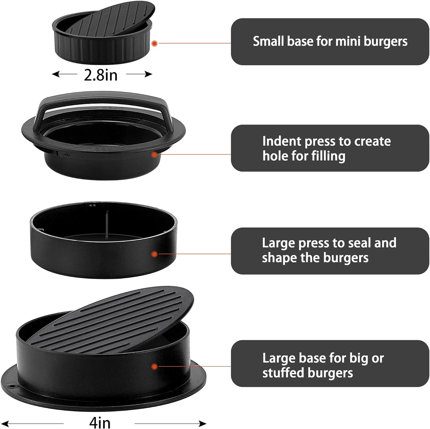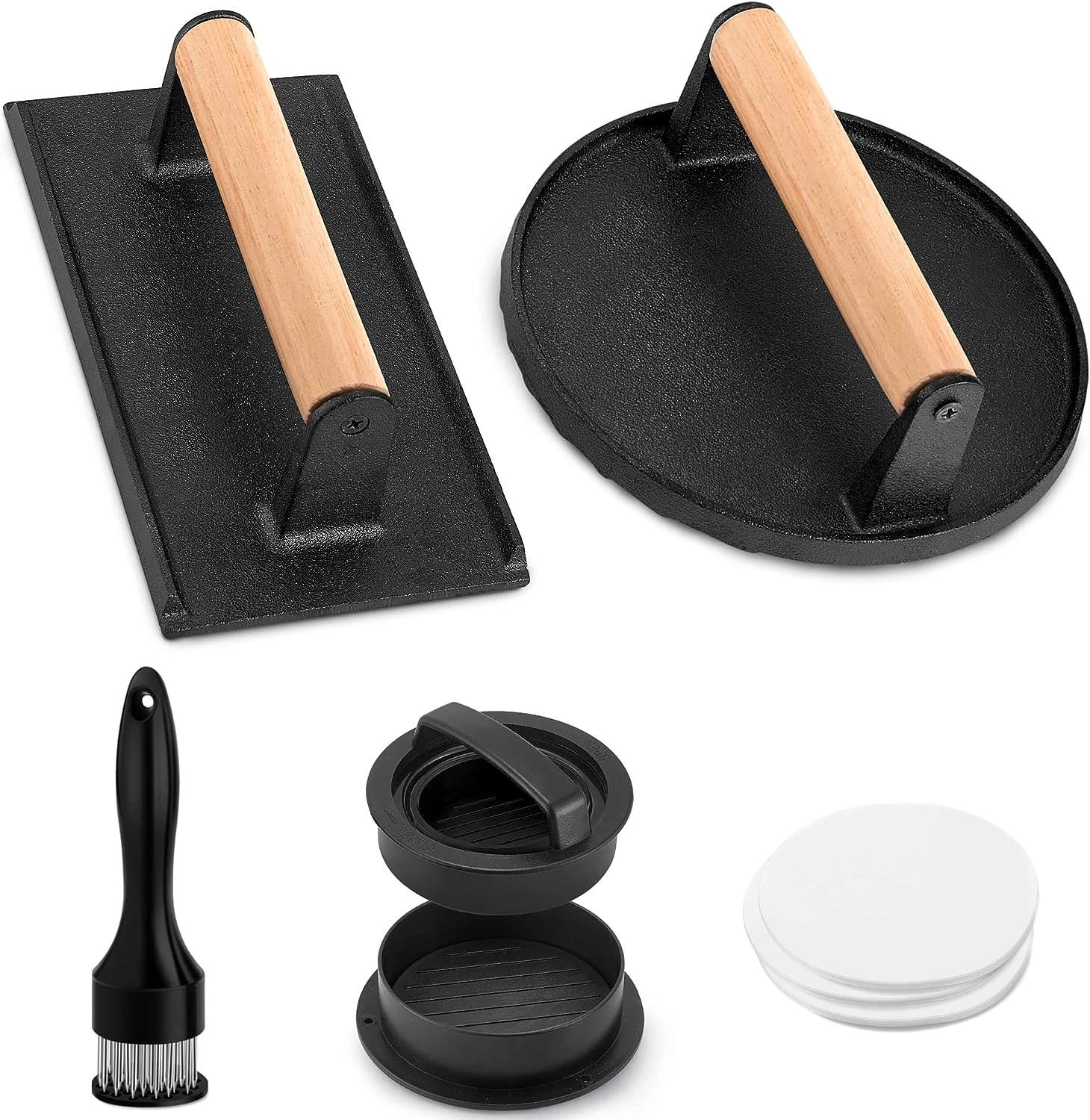 - Professional tools for making burgers, including rectangular grill press, round burger press, burger press patty maker mold, meat tenderizer and 90 burger patty papers, burger patty maker helps you make regular patties and stuffed patties with consistent thickness and shape, plus wax patty papers to prevent your freshly made burger patty from sticking, burger press can smash the burger patties while adding a unique flavor, perfect for all gas or electric grills, flattop, teppanyaki and skillets