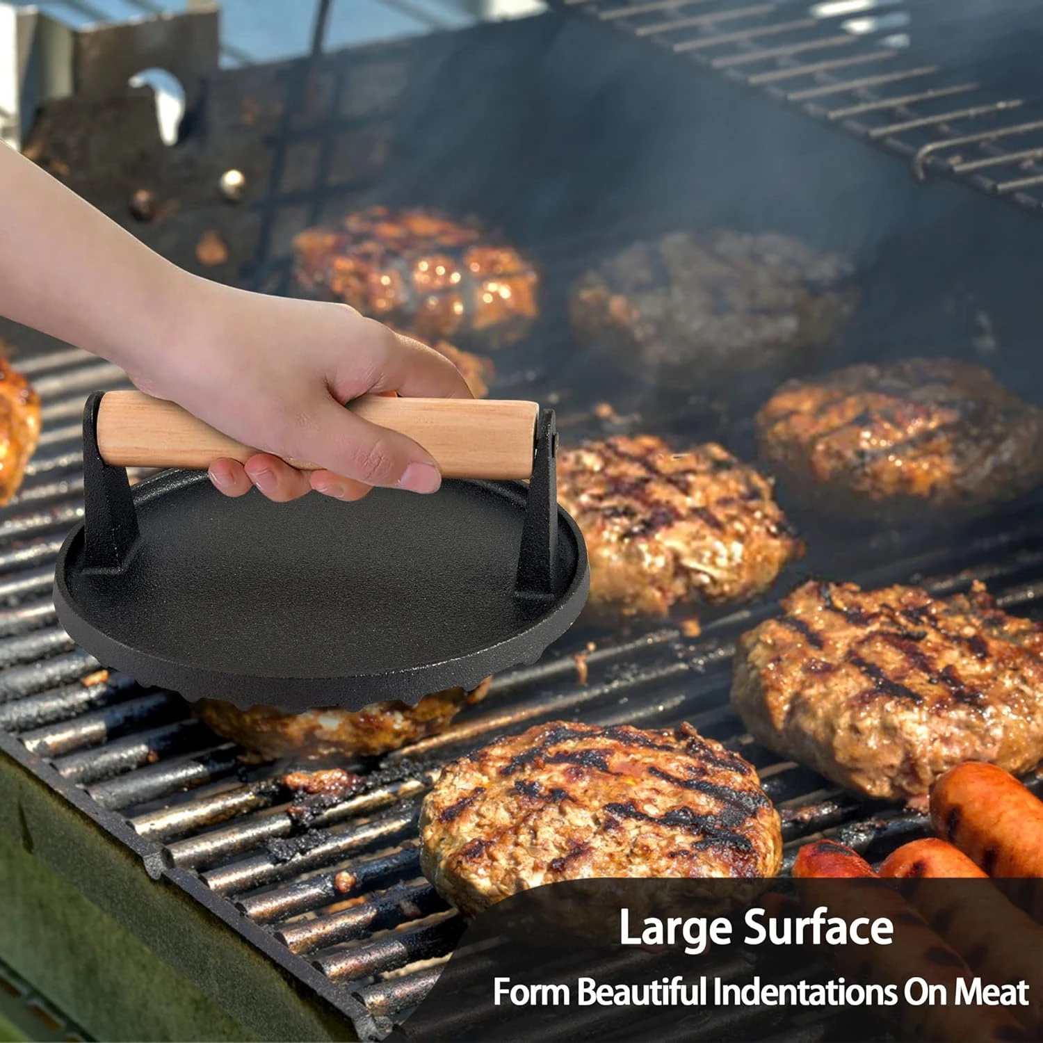 - Heavy duty grill press, rectangular and round grill press are made of 100% food grade cast iron without any harmful coating released into your food, heavy duty and corrosion resistant, grill press with large surface can press more food at once, flattening the meat and keeping its shape, the line grooves and grid grooves on the non-stick bottom can form beautiful grill marks on meat, increasing the visual appeal