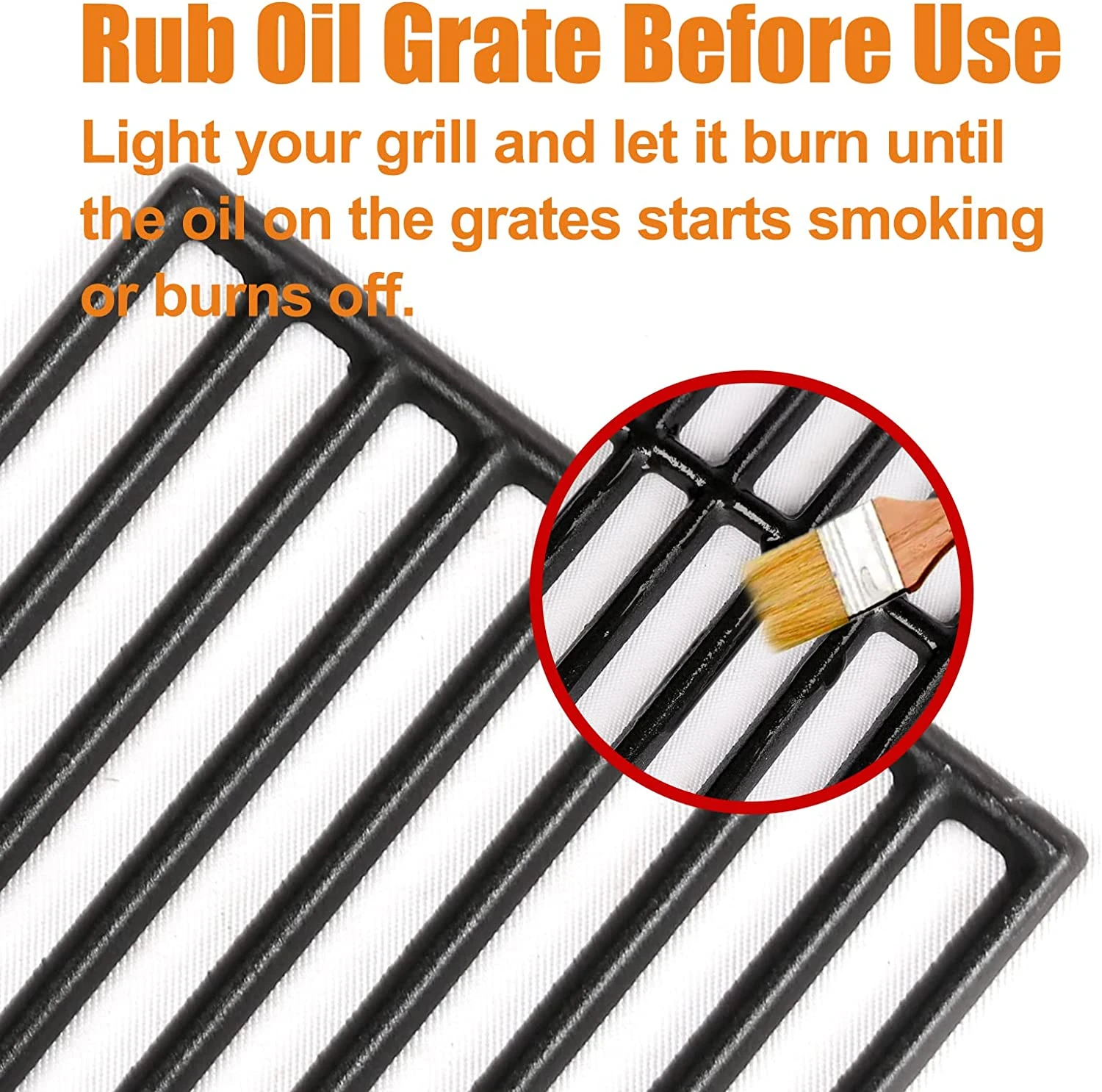 - 【Basic Clean Your Cast Iron Cooking Grates】(1) Heat grill for 15 mins to a minimum of 400 ℉, scrape off dirt from grill grates with grill brush and scraper, wet brush frequently while brushing; (2) Season the Char-broil grill grates, and wipe each corner of the baking net with a dry towel; (3) If you need to store your grill for a long period of time, heavily coat them in cooking oil, wrap them in a plastic bag and store in your covered grill.