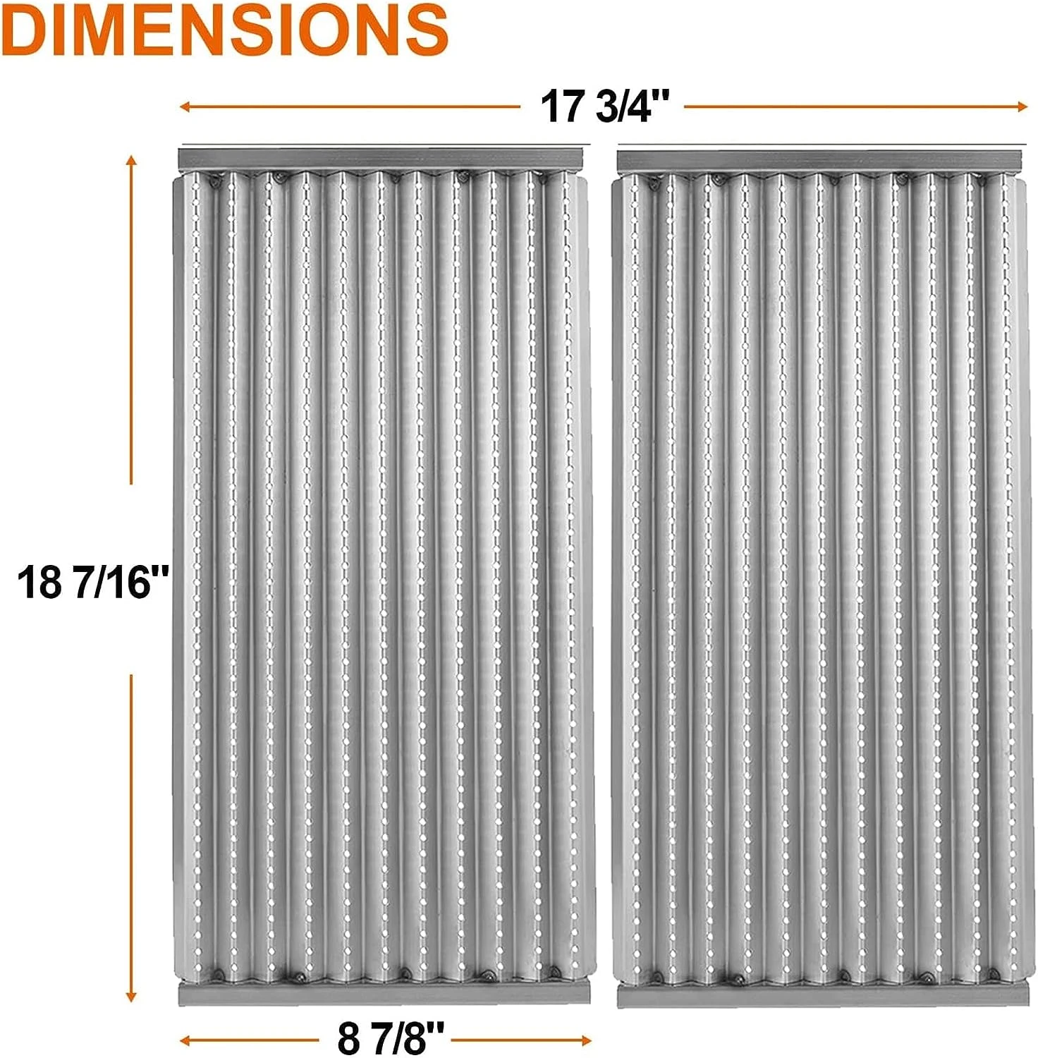 - ✅【Package & Dimensions】2-Pack Stamped Stainless Steel Emitters. [Dimension] 18 7/16″ x 8 7/8″ per emitter, 18 7/16″ x 17 3/4″ Total. Grill grate replacement parts for charbroil tru infrared grill grates