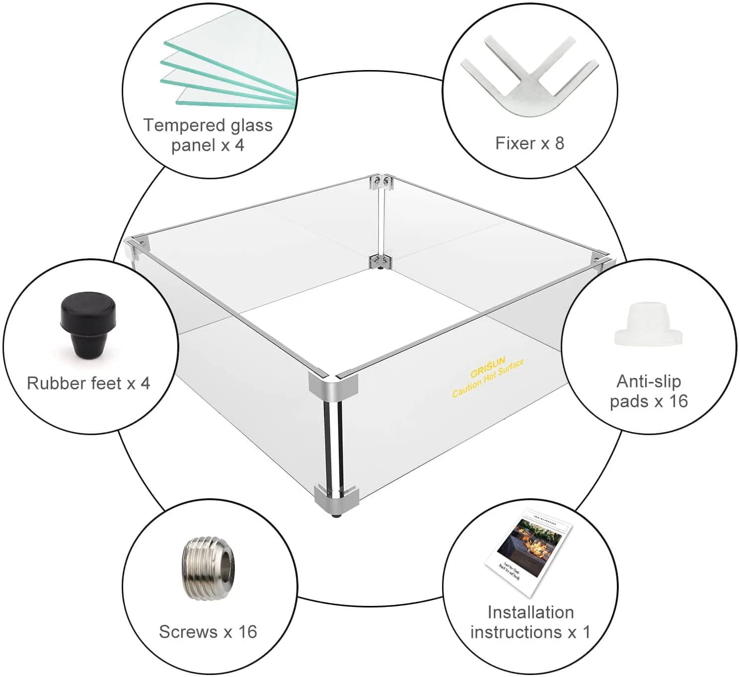 - 【Durable & Stable】: The fire pit glass wind guard is made of extra-thick tempered glass of 5/16 inch thickness, with smooth edges and rounded aluminum corner brackets and non-slip rubber feet for superior heat resistance, explosion resistance and stability.