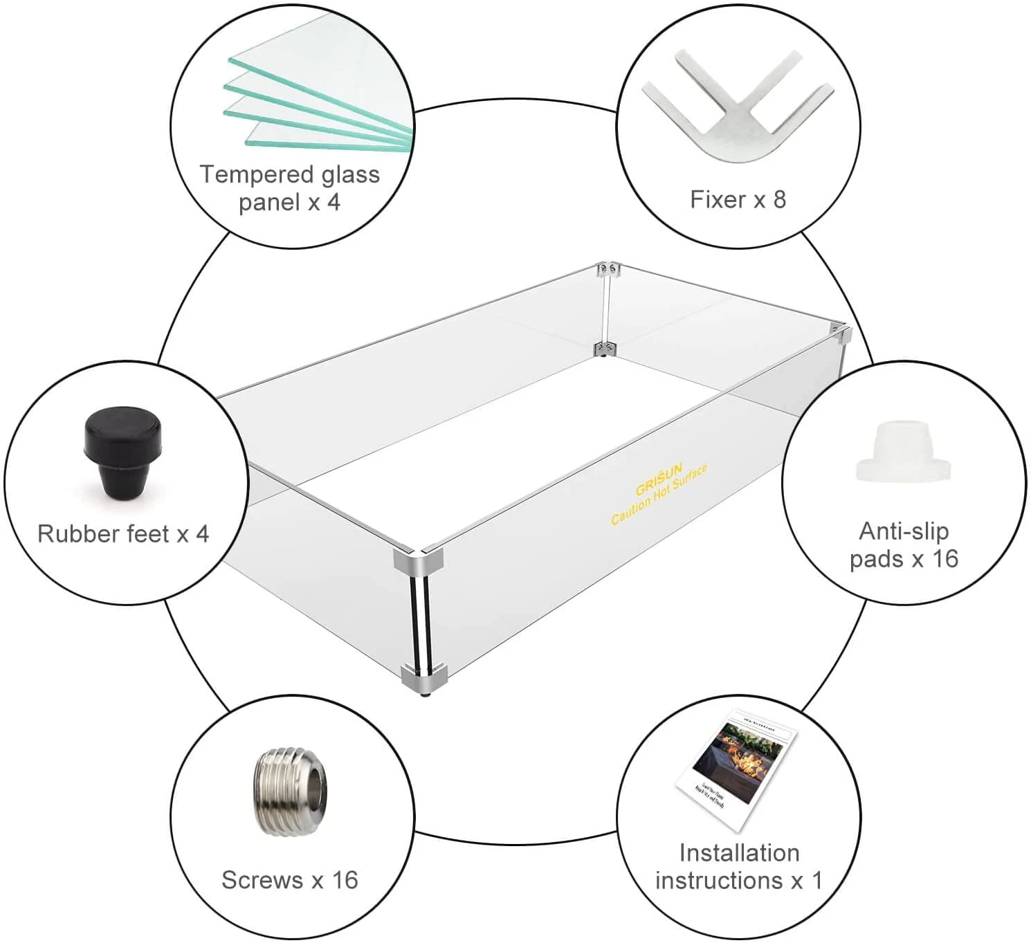 - 【Durable & Stable】: The fire pit glass wind guard is made of extra-thick tempered glass of 5/16 inch thickness, with smooth edges and rounded aluminum corner brackets and non-slip rubber feet for superior heat resistance, explosion resistance and stability.