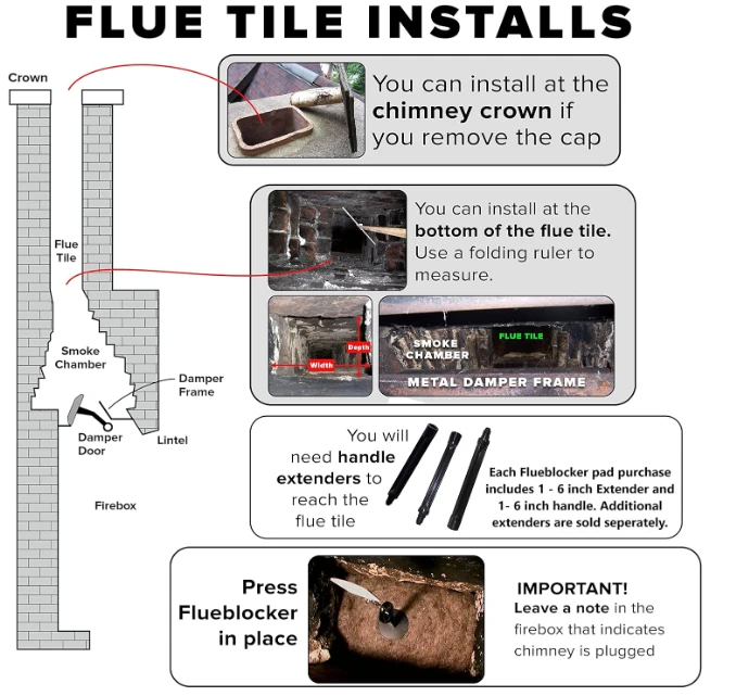 - The 12×12 Chimney Flueblocker (Actual product dimensions are 13″x13″) pressure fits into your 12″x12″ or smaller flue tile stopping drafts, odors and debris from coming into your home through the fireplace.It can be trimmed with scissors to accommodate sizing and hardware.