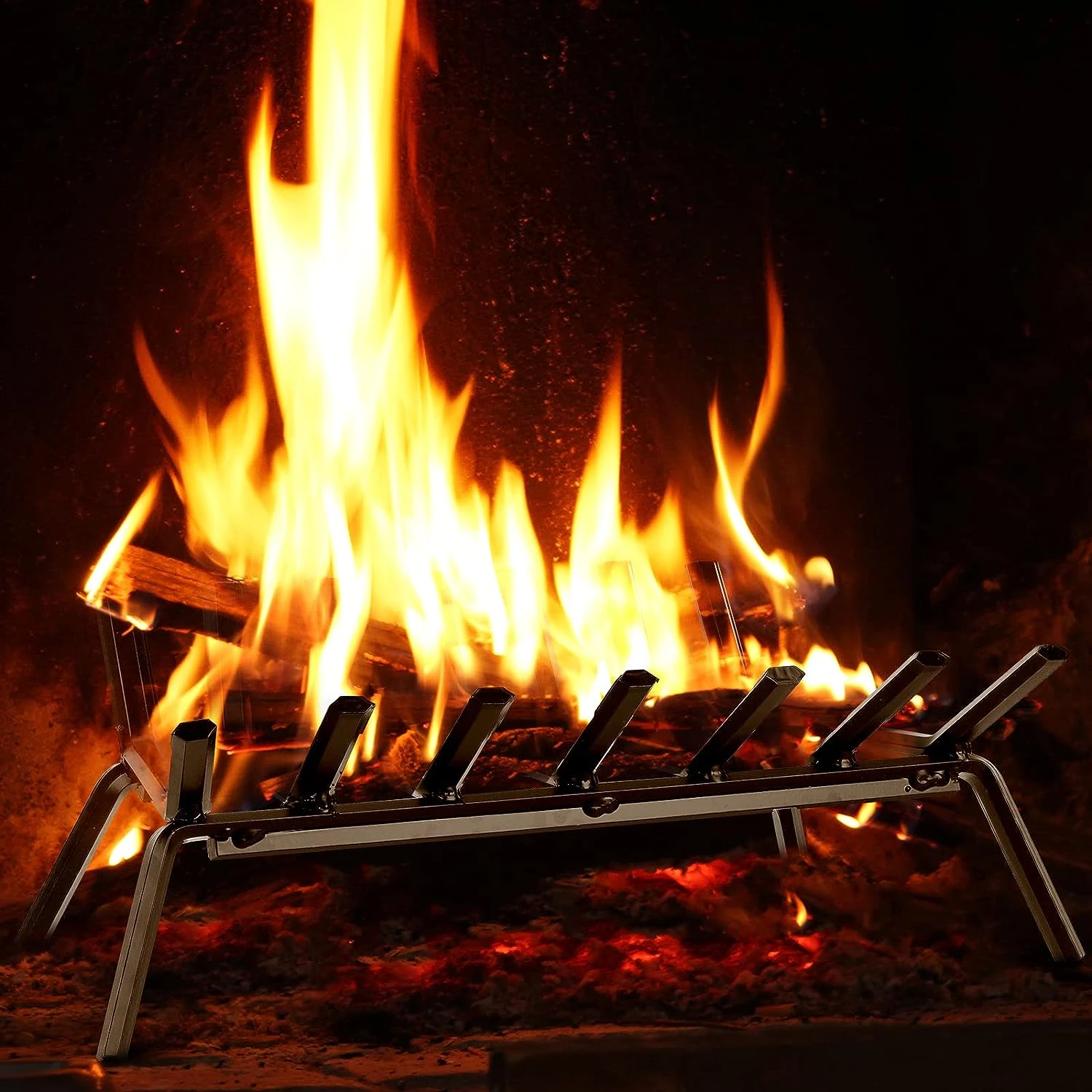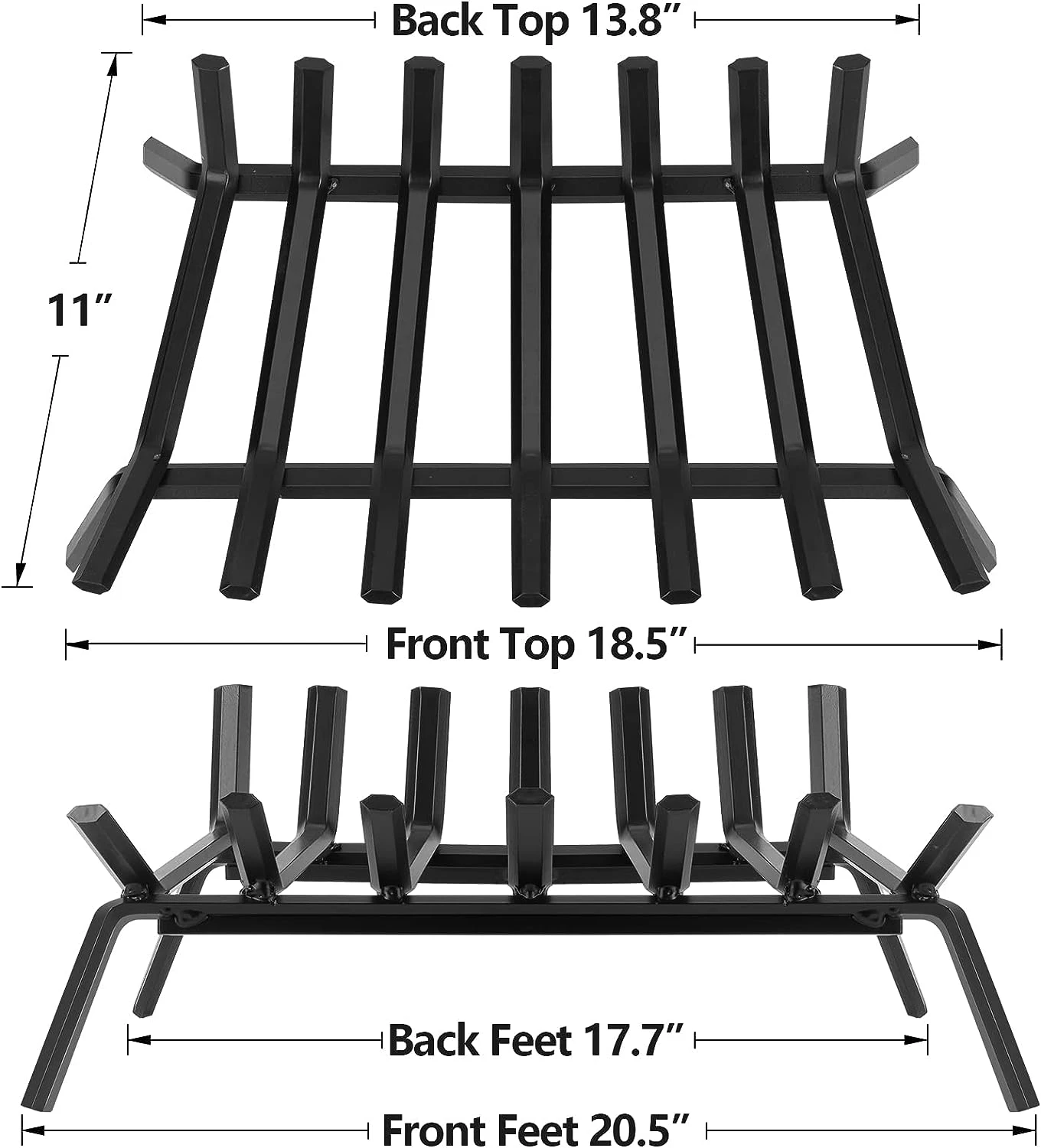 - HEAVY DUTY STEEL: Heavy duty wrought iron fireplace log burning grates crafted from thick and solid 4/5 inch square bar steel. Fireplace grate measures 21in long x 11in wide x 6.7in high. Strong durability for daily burning, holding woods firmly, wood burning lasting. Ideal quality daily burning wood rack for your fireplace and outdoor camping.