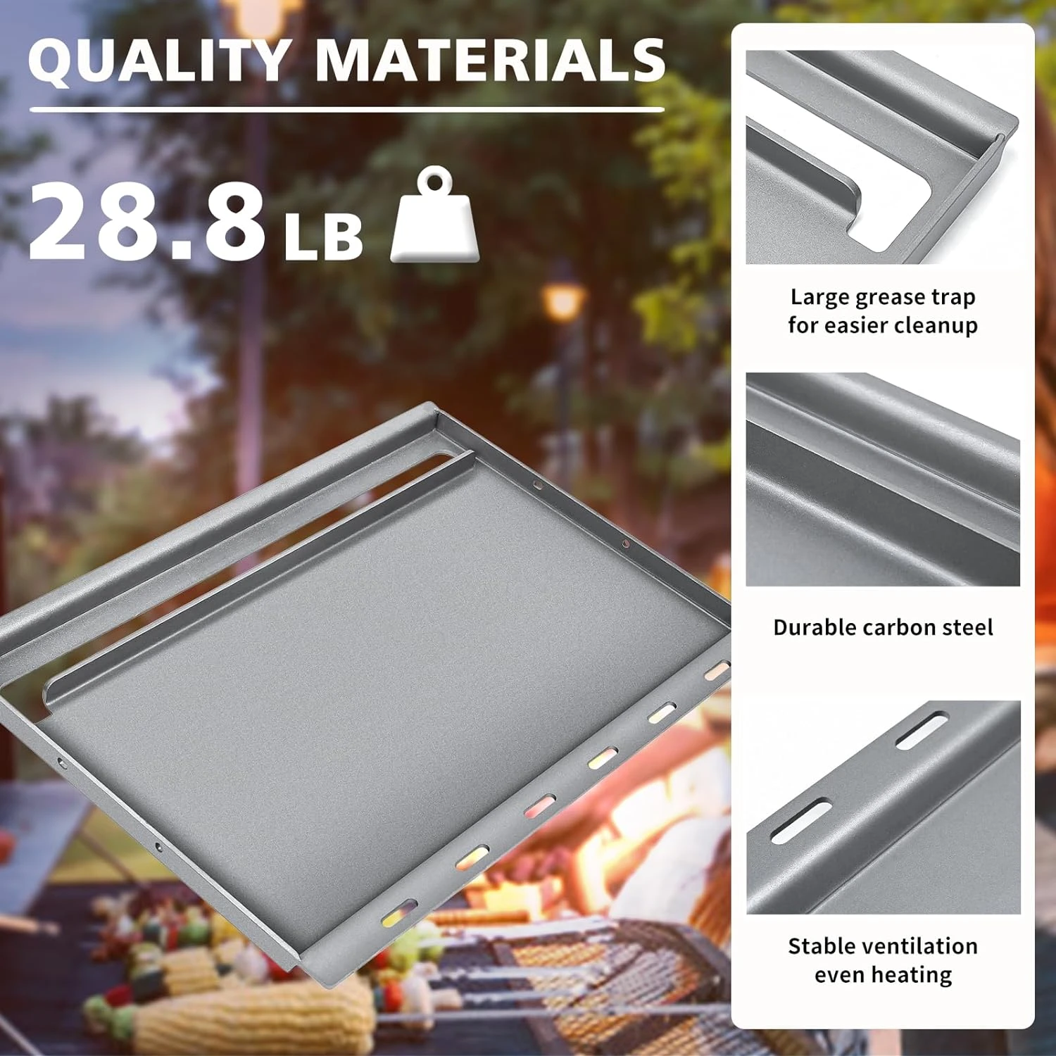 - HEAT ENENLY: Made of durable carbon steel to ensure long-lasting use. Carbon steel not only can make the heat rise rapidly, but also keep warm well and provide enough heat for food. Meat can better lock in moisture, making food more juicy and delicious. It is perfect for the Weber Genesis series, just easily remove the grill grates, and you can get a perfect griddle grill, with the very perfect design to bring you a new grill experience!