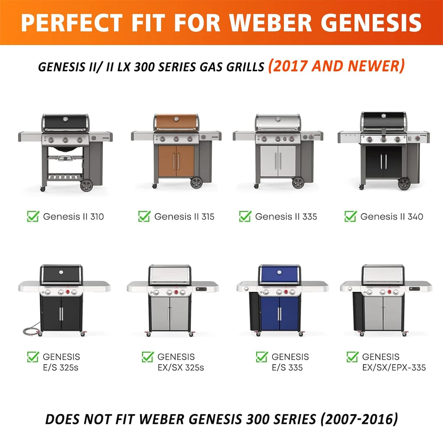 - COMPATIBLE: Perfect fit for Weber Genesis E/S-325, Genesis E/S-335(2022), Genesis EX/SX-325s, Genesis EX/SX/EPX-335, for Genesis II/ II LX 300 series gas grills (2017 and newer), Genesis II E/S-310, Genesis II E/S-315, Genesis II E/S-335, Genesis II E/S-345, Genesis II LX 340. Does not fit the Weber Genesis 300 series (2007-2016).