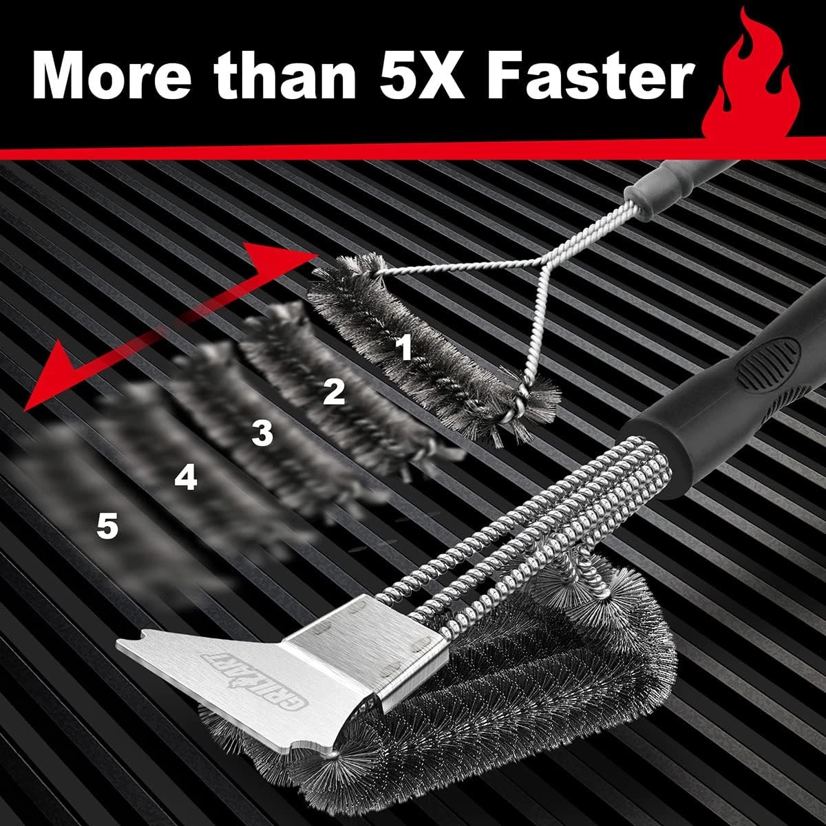 - 5x Faster Clean – Three times more bristles than the traditional bbq grill brush, but also pretty sharp and strong and have enough lateral flex. Can reach more areas of your grill at the same time and easily get the gunk off from edges and corners. 5 faster cleaning than ordinary bbq grill cleaner brush and get your job done in seconds!