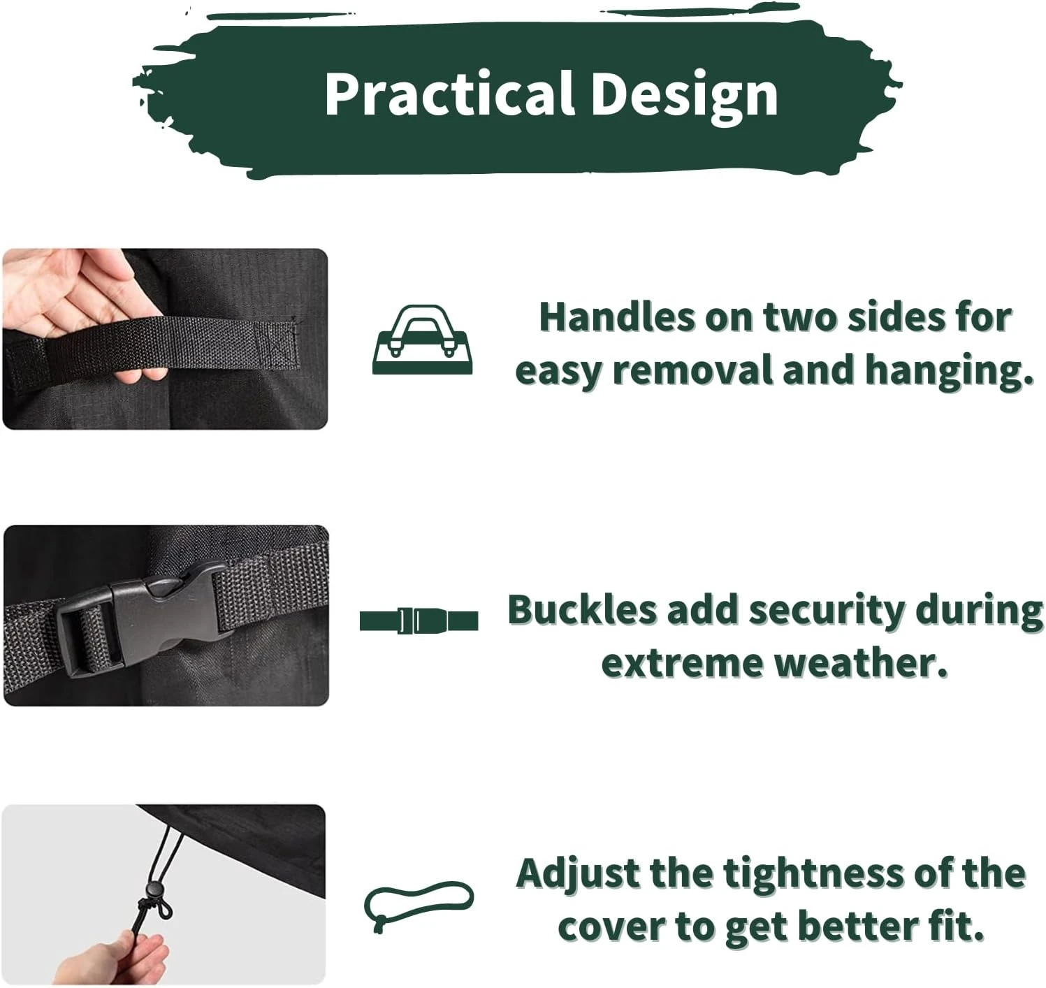- 【Easy To Use】Durable fabric handles on two sides for easy fitting and removal effortlessly in seconds. Handles can also be used for hanging and storage. Two adjustable buckle straps on each side of the cover and a drawstring buckle, add security during extreme weather.