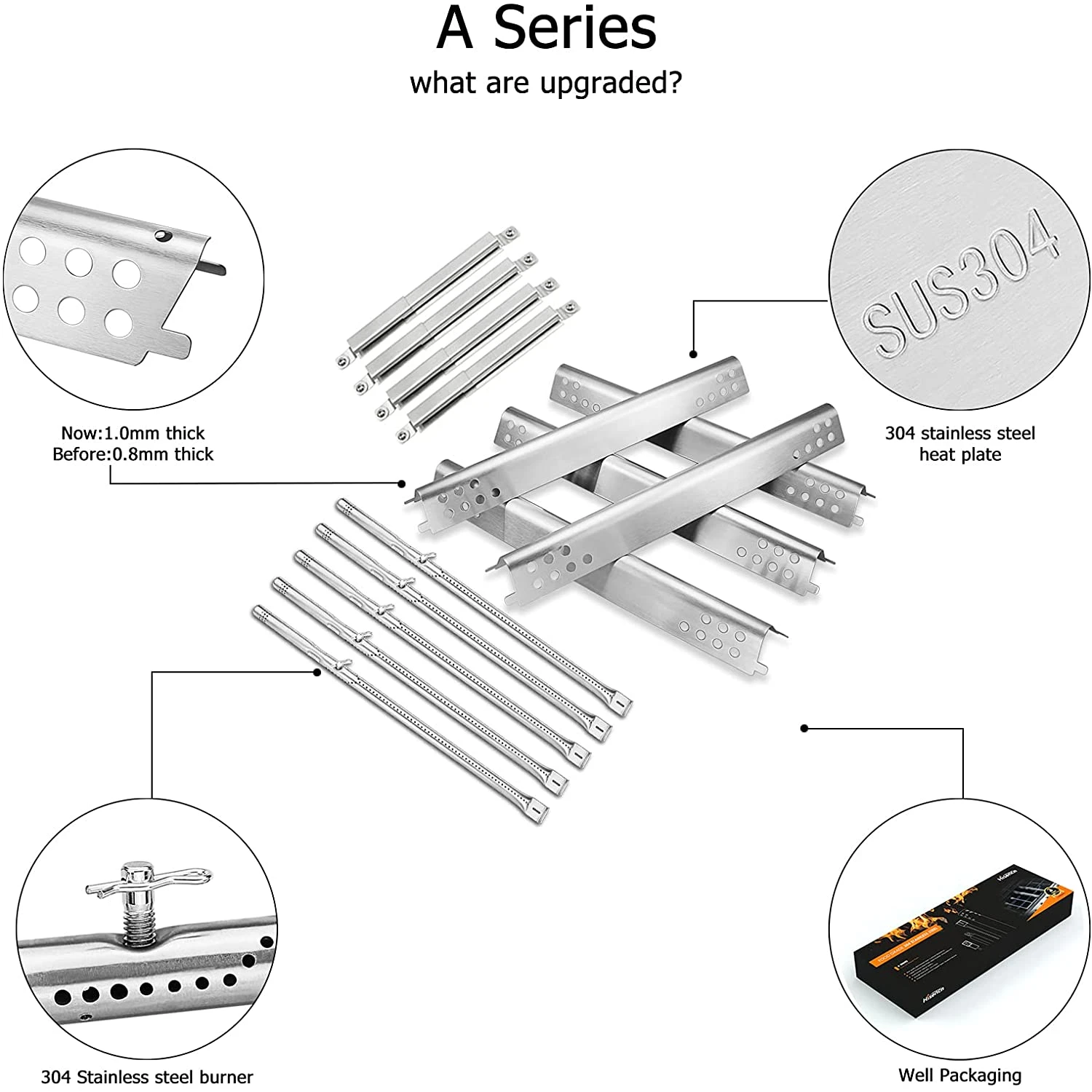 - Package: Repair kit includes 5 x grill burners, 5 x heat plates, 4 x adjustable crossover tube, 1x instruction.