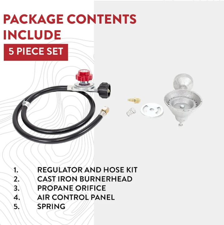 - Includes – cast iron high-pressure burner head 0-20 psi high-Pressure regulator and 4 ft hose