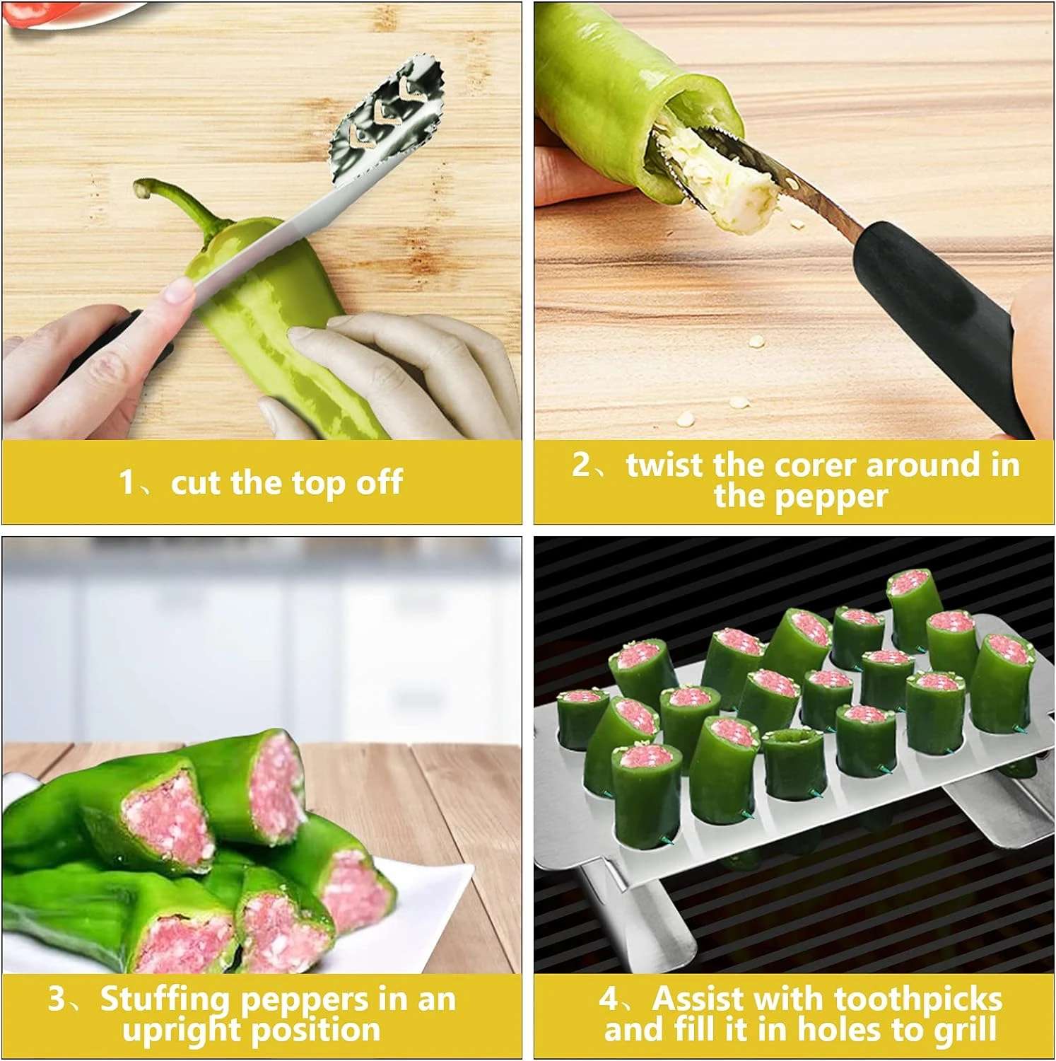 - 【Convenient and Easy to Wash】– The handles on both sides are easy to lift and remove from the grill, Including the pepper coring tool, which also has an easy grip. Made of heavy-duty stainless steel, it won’t bend and keep its shape after many times of uses. Dishwasher safety makes cleaning easy.