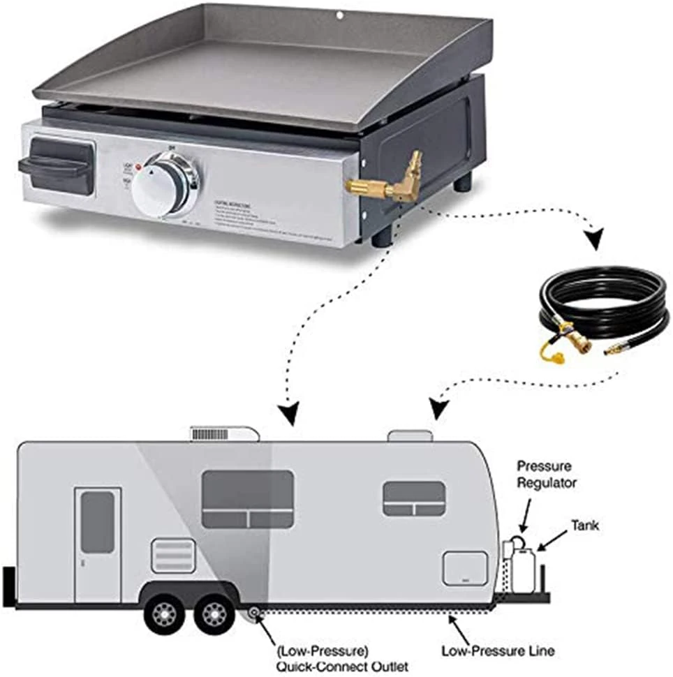 - 【Perfect Propane Adapter】Our connector is specifically designed for the Blackstone 17 inch and 22 inch tabletop griddles. This quick connect adapter fitting can perfectly converts the 17 inch and 22 inch Blackstone Grill to a 1/4 inch female quick disconnect low pressure propane extension hose. So that your Blackstone griddle can be easily connected to the low pressure system on a travel trailer or camper.
