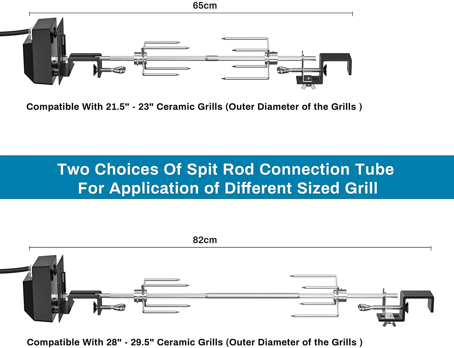 - Universal Rotisserie Kit Fits Large Big Green Egg, Kamado Joe Classic, Pit Boss K22 & Other 21.5″-23″, 28″-29.5″ Ceramic Grills.